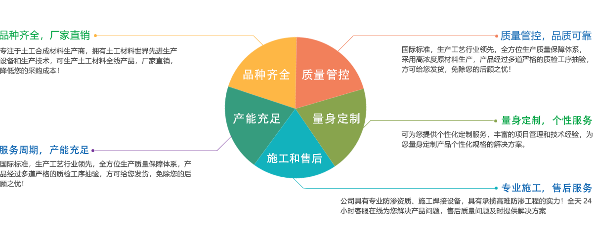 公司所有產品均采用國際標準組織生產,并經國家、市技術監督局采標驗收,生產工藝及水平全國領先,屬國內優等水平,實物質量達到國際先進水平。經用戶、施工單位使用證明,質量穩定可靠、施工方便、價格合理、售后服務完善。產品主要應用于農業、海綿城市建設、公路、鐵路、垃圾填埋場防滲,水利、電力、水土保持及環境綠化與基礎建設領域,已被廣泛應用于高速公路、鐵路、垃圾填埋場等多項國家重點工程,受到工程界專家及廣大用戶的一致好評。